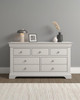 The Vermont 3+2 Drawer Chest In Ivory offers stylish storage for your bedroom. This practical chest keeps your clothes organised in two deep spacious drawers and three smaller drawers at the top which are perfect for socks and underwear. Characterised by a warm paint finish and light, contemporary touches, the Vermont range exudes timeless elegance. Featuring a decorative plinth and detailed tops, the collection would add a fresh, light and airy charm to any home. Available in a choice of ivory or pebble grey, each piece comes with two handle choices - a matching colour finish or brushed steel to personalise the look.