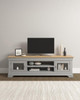 The practical Vermont TV Stand In Pebble Grey / Oak comfortably houses a large screen TV and provides ample storage for all your entertainment essentials. The unit has a spacious cupboard with a stylish glass front at either end and in the centre there are two open shelves, ideal for storing media accessories and games consoles. Characterised by a warm paint finish and contrasting waxed oak top, the Vermont range exudes contemporary country charm. Featuring a decorative plinth and detailed tops, the collection would add a fresh, light and airy elegance. Available in a choice of ivory or pebble grey, each piece comes with two handle choices - a matching colour finish or brushed steel to personalise the look.